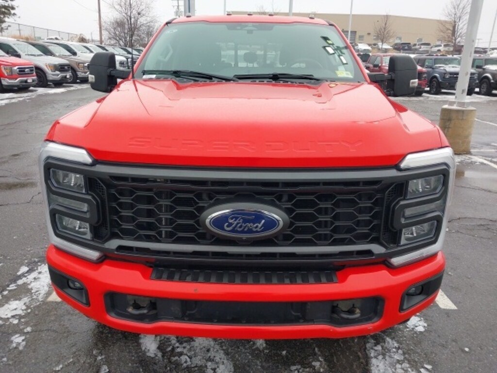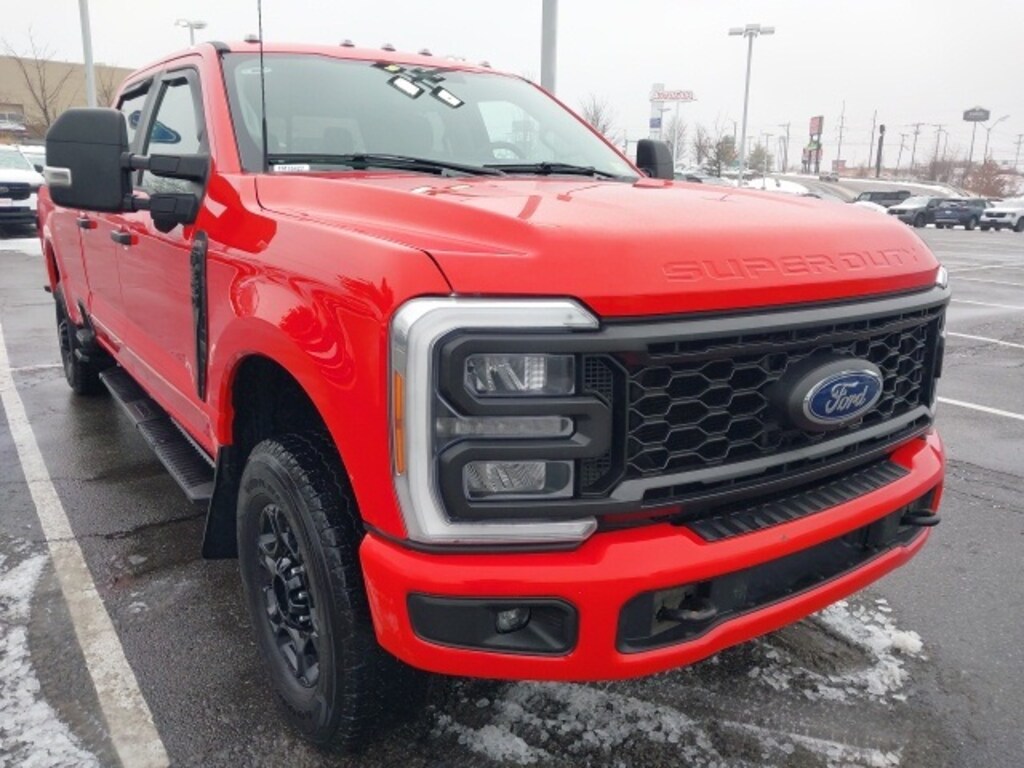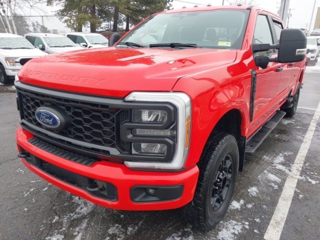 This 2023 Ford F-350 Super Duty XL 4WD in bold Race Red is built to handle the toughest jobs with confidence, powered by the formidable 7.3L V8 gas engine producing 405 horsepower. A CARFAX One-Owner truck with a Clean CARFAX, this heavy-duty pickup is Ford Gold Certified and equipped with the GVWR 11,800-lb Payload Package, electronic-locking rear axle with 3.73 ratio, and the FX4 Off-Road Package featuring off-road tuned shocks, hill descent control, skid plates, and a unique FX4 box decal. The STX Appearance Package enhances its commanding presence with 18" ebony black painted aluminum wheels, painted grille, body-color front and rear bumpers, LED fog lamps, and roof clearance lights.