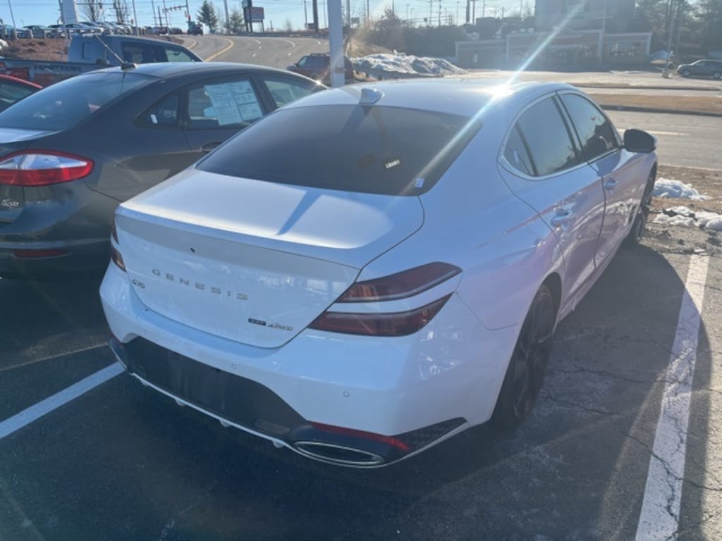 This 2022 Genesis G70 3.3T AWD in elegant Alta White delivers exhilarating performance and refined luxury, powered by a twin-turbocharged 3.3L V6 and enhanced by all-wheel drive for confident handling in all conditions. A CARFAX One-Owner vehicle with a Clean CARFAX, this sport sedan features the Sport Prestige Package and Option Group 04, bringing premium performance upgrades like Brembo brakes, electronically controlled suspension, limited-slip differential, variable exhaust valve system, and striking 19" sport alloy wheels. The bold dark chrome grille and athletic stance reflect the G70s dynamic driving character.