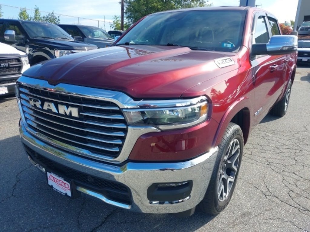 The 2025 Ram 1500 Laramie in Delmonico Red Pearlcoat is a bold and luxurious full-size pickup that blends high-end comfort with serious capability. Powered by a refined 3.0L I6 engine and equipped with 4WD, this truck is ready for both heavy-duty tasks and refined daily driving. With a CARFAX One-Owner history, a Clean CARFAX, and backed by an AutoFair Certified Warranty, it offers both reliability and peace of mind. The Laramies striking chrome accents, 20" premium wheels, and Wheel-to-Wheel Side Steps give it a commanding presence, Remote Tailgate Release, and Class-Exclusive Air Suspension make it as functional as it is attractive.